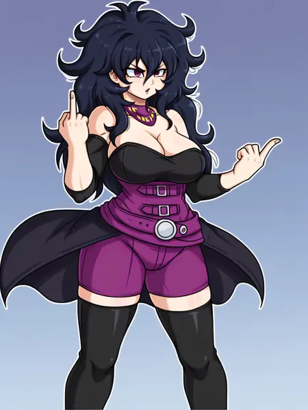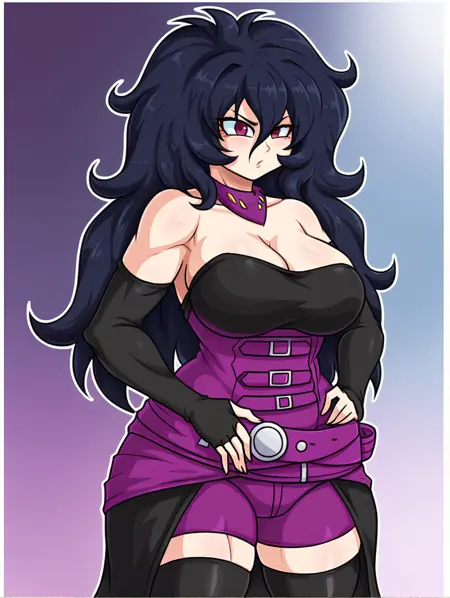 Ali, black_hair, long_hair, thighhighs, boots, purple_eyes, breasts, bare_shoulders, messy_hair, cleavage, belt, large_breasts, brown_footwear, purple necklace, black_thighhighs, strapless, detached_sleeves,purple belts, purple shorts, black skirt