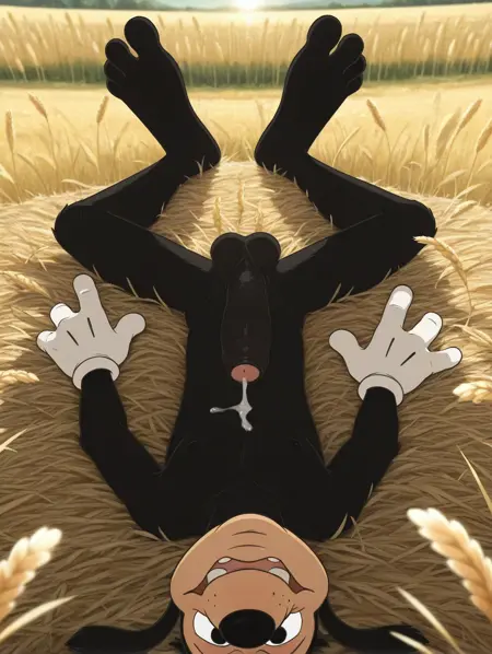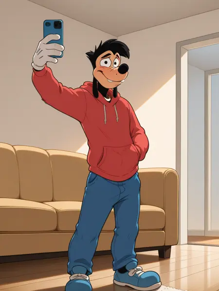 lora:Max-Goof-Illustrious:1,max-goof, solo, 1boy, male focus, black eyes, white gloves, full body, furry male,red shirt, blue pants, blue shoes,
