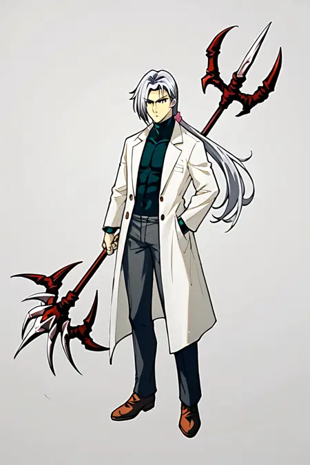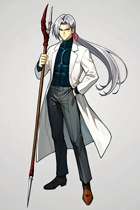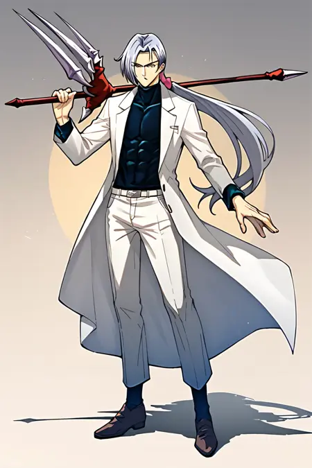 tamamo, 싱글, 무기, 1소년, 남성 중심, 손에 들고, 무기 든, 코트, 긴 머리, 창, 회색 머리, 전체 몸, 파니테일, 시청자 바라보기,