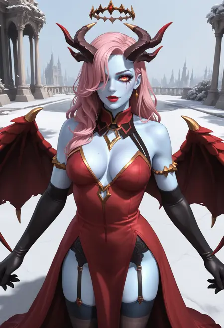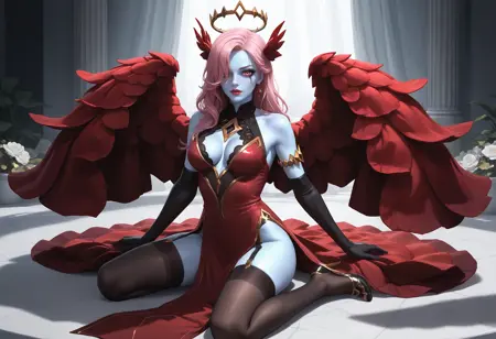 衣装2タグ(「リスフルの薔薇」セット):1girl、solo、悪魔の少女、角、長い髪、ピンクの髪、片方の目に髪がかかっている、青い肌、色付きの肌、胸、中程度の胸、out2、ドレス、赤いドレス、胸元、手袋、肘まで手袋、黒い手袋、肩を露出、太ももハイソックス、黒い太ももハイソックス、ガーターストラップ、翼、赤い翼、ハロー、