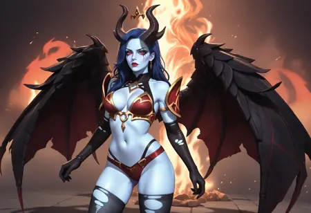 主要タグ:1girl、solo、大人の女性、悪魔の少女、色付きの肌、青い肌、赤い目、長い髪、黒髪、胸、中程度の胸、角、out1、へそ、胸元、アーマー、ビキニアーマー、太ももハイソックス、裂けた太ももハイソックス、手袋、肘まで手袋、ブーツ、ハイヒール、翼、長い脚