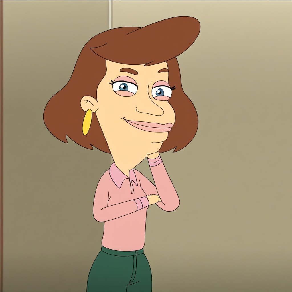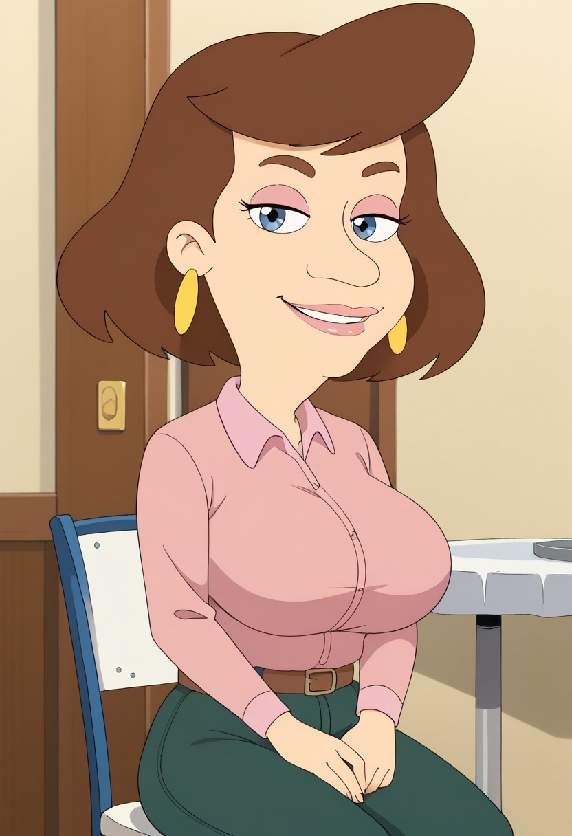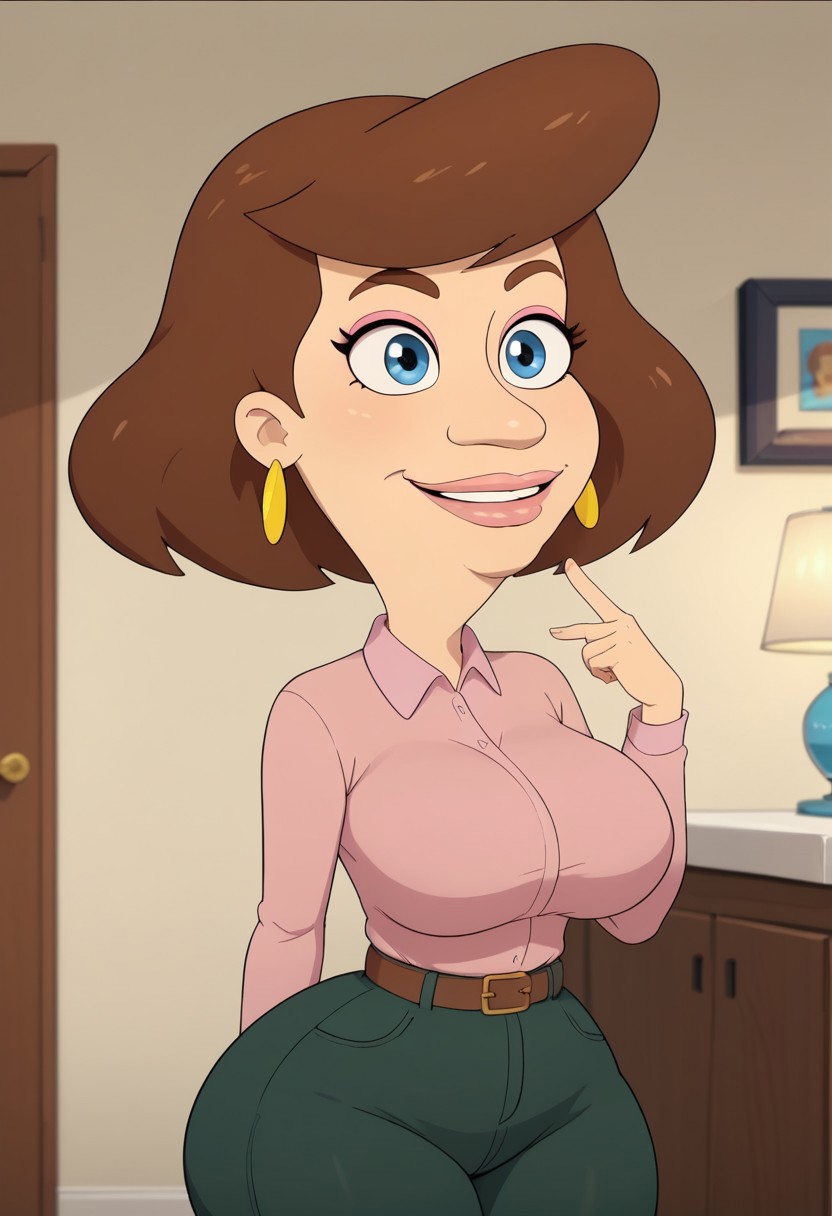 Trigger words: 1girl, Solo, Barbara_BM, light skin, light blue eyes, brown eyebrows, brown hair, short hair, pink lips, pink eyeshadow, pink long-sleeved polo shirt, brown belt, green pants, gold disc earrings, dark brown loafers