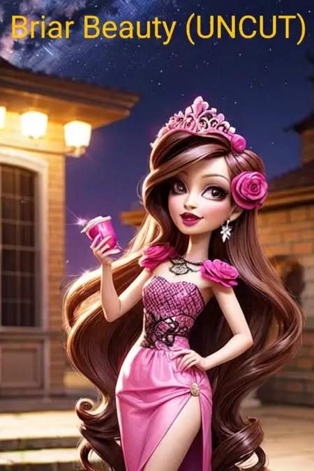 briar beauty, ever after high, dark skin, brown hair with pink highlights, pink-brown eyes
