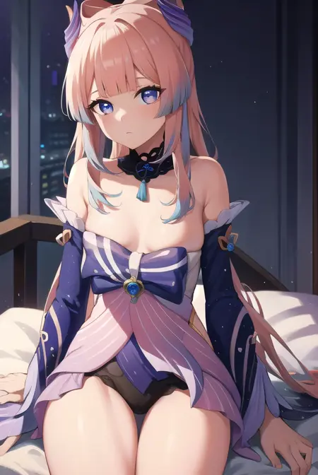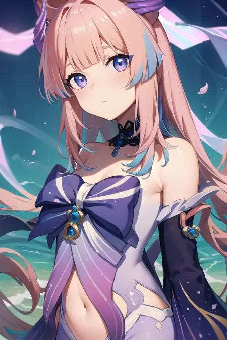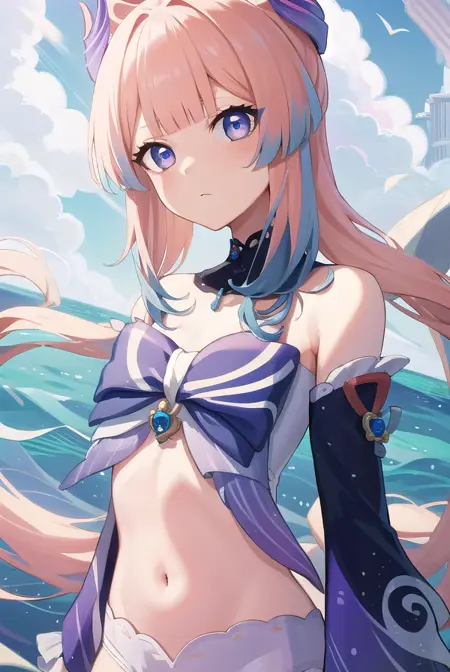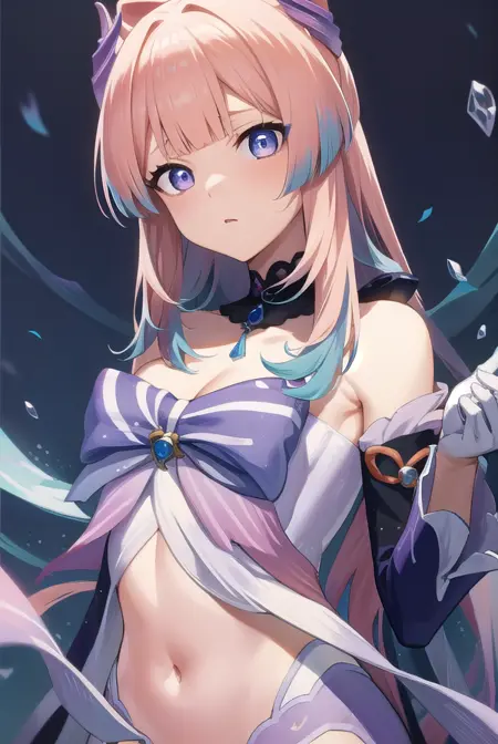 kokomi, 青い目, 青い髪, 直線的な前髪, 直線的な先端, ボウ形状の髪, グラデーション目, グラデーション髪, 髪飾り, 長い髪, 多色目, 多色髪, ピンクの目, ピンクの髪, サイドロックス, 二色髪, vision (genshin impact), 瞳孔なし,