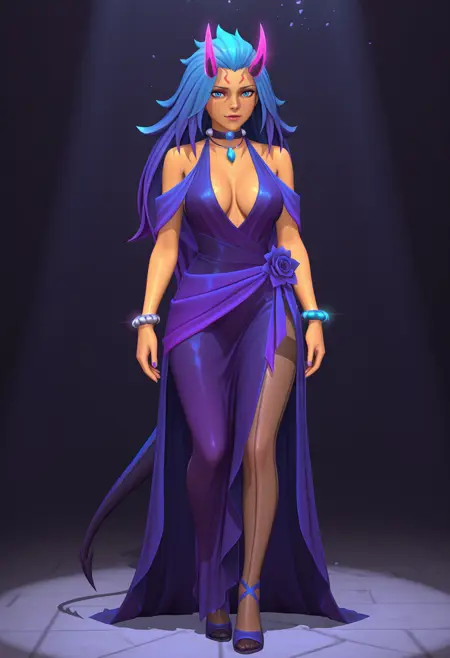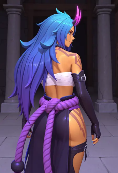 主要标签:1girl,单人,蓝眼睛,长发,蓝发,角,乳房,深色皮肤,深色皮肤女性,肚脐,sarashi,破烂衣服,手套,露指手套,肘部手套,黑色手套,珠宝,项链,念珠,珠子,珠串项链,纹身,指甲油,过膝袜,绳子,长裤,单侧过膝袜,项圈,露趾鞋,脚趾甲,