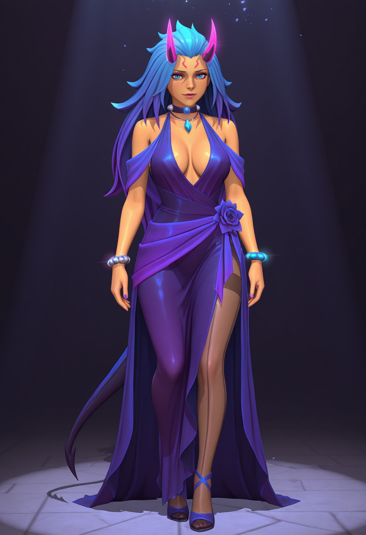 main tags: 1girl, solo, blue eyes, long hair, blue hair, horns, breasts, dark skin, dark-skinned female, navel, sarashi, torn clothes, gloves, fingerless gloves, elbow gloves, black gloves, jewelry, necklace, prayer beads, beads, bead necklace, tattoo, nail polish, thighhighs, rope, pants, single thighhigh, choker, toeless footwear, toenails,