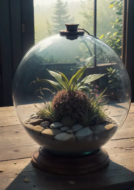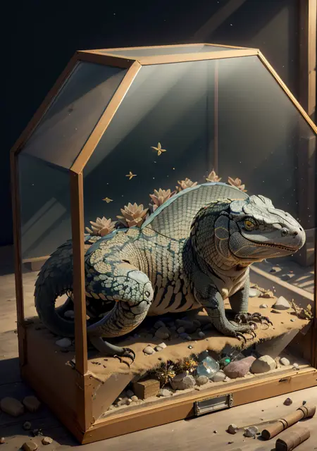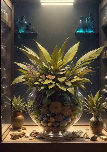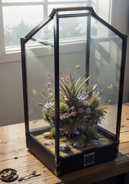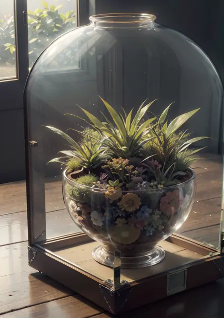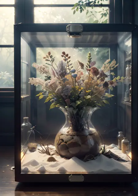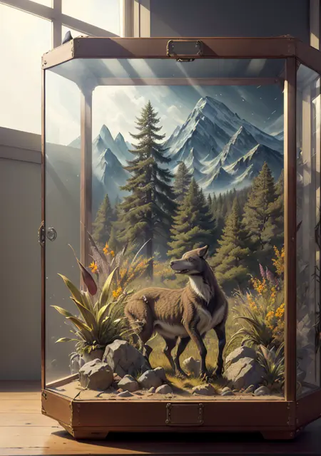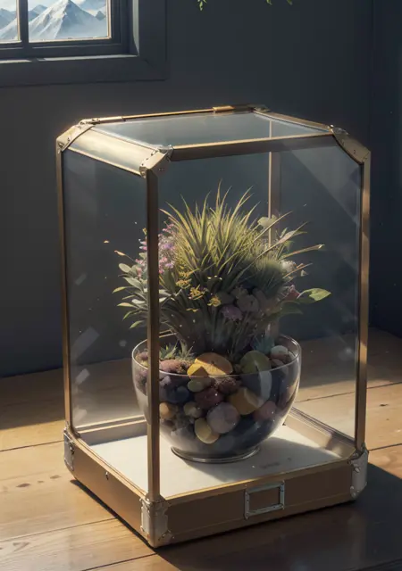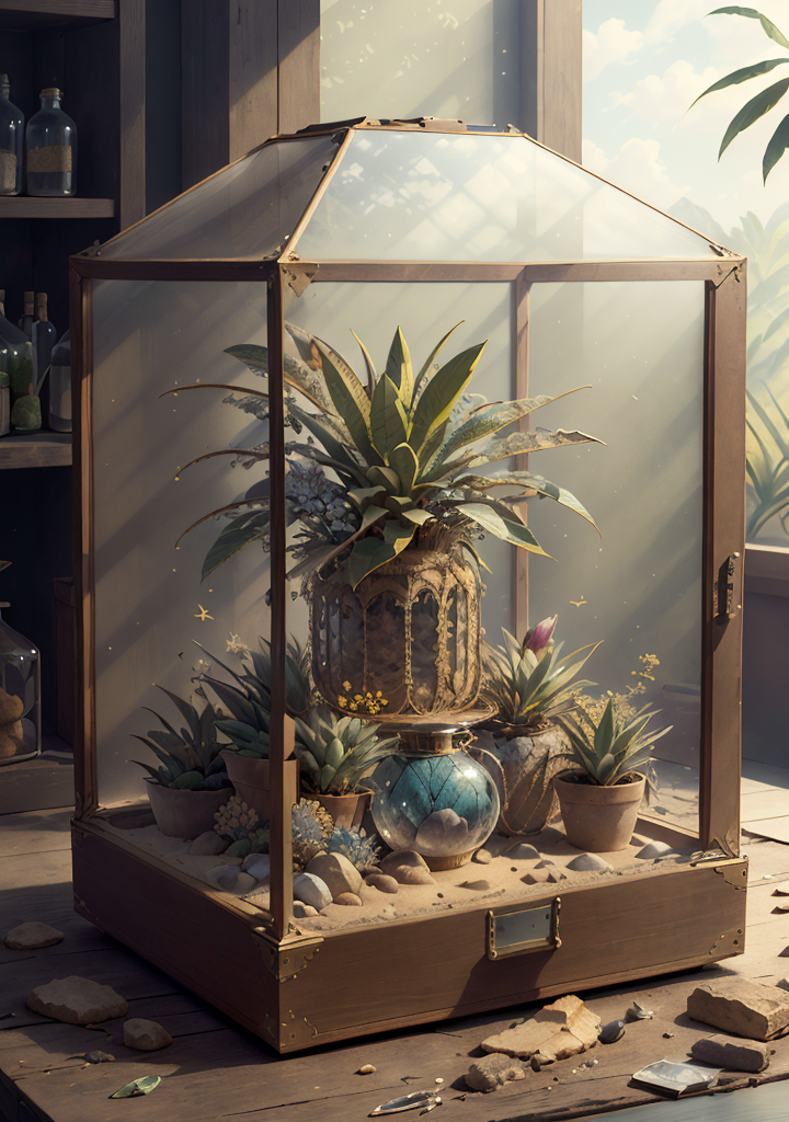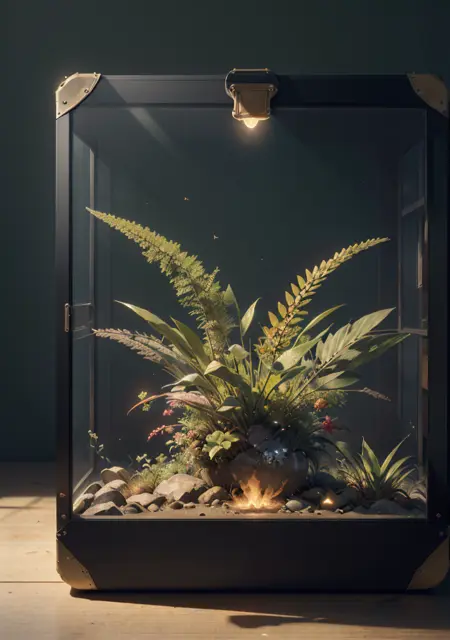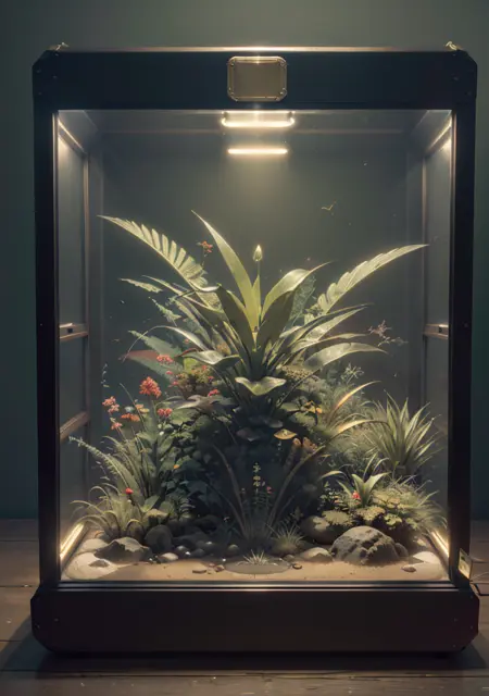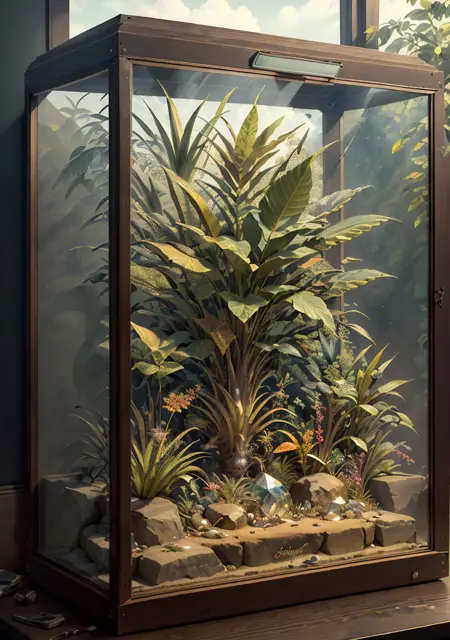 (トロピカルジャングル)、(KnollingCaseQuironスタイル)、ガラスケース、ディスプレイケース、(KnollingCase:1.4)、 lora:quiron_KnollingCase_v1_lora:0.77