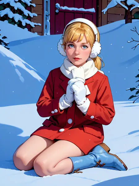 追加: 1girl, solo, 金髪, 前髪, ポニーテール, 赤い冬コート, 白いスカーフ, 赤と白の耳あて, 白い手袋, 裸の脚, 青い冬靴