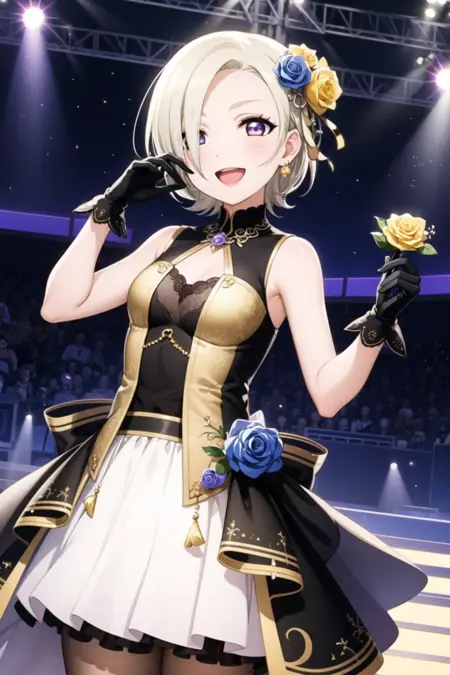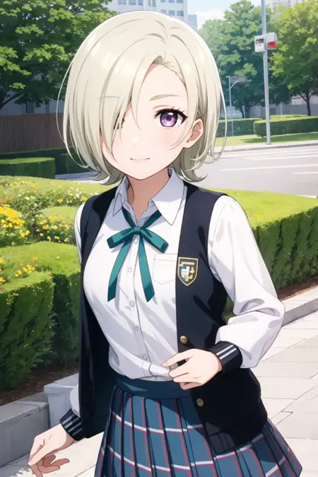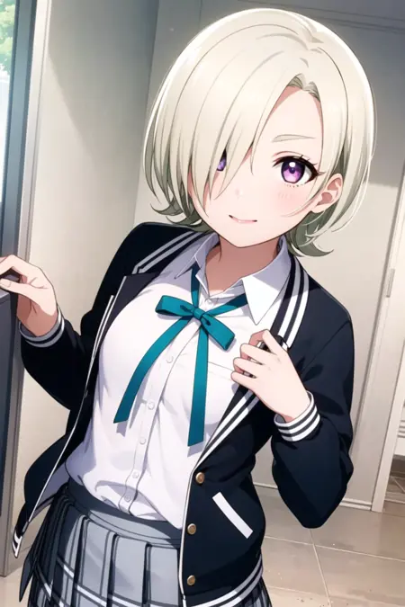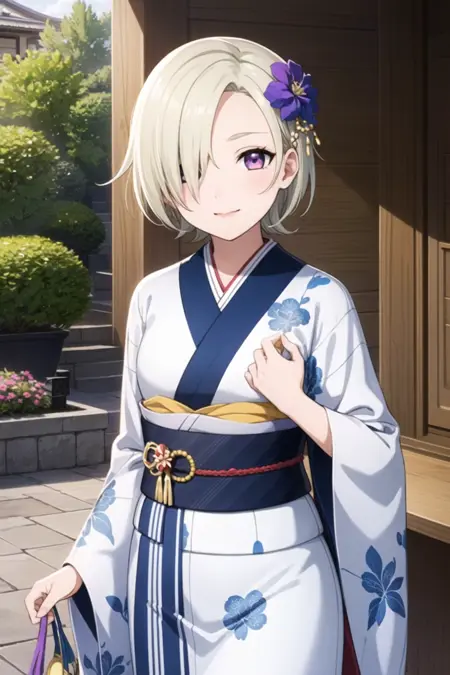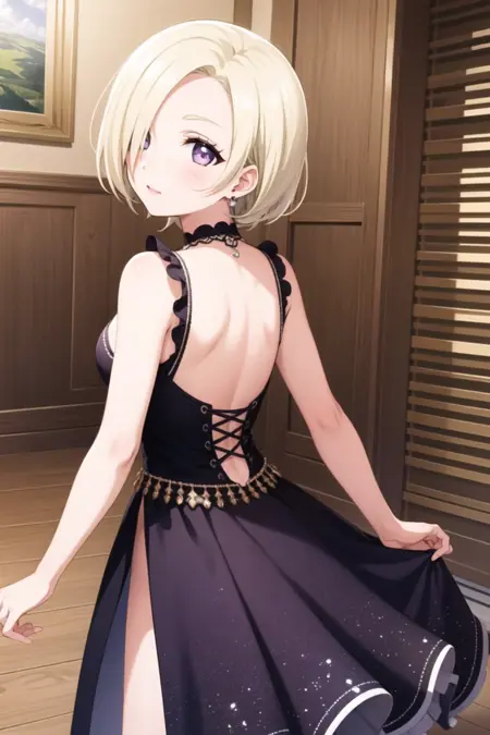필요한 태그: 1girl, solo, mia taylor, blonde hair, hair over one eye, small breasts, purple eyes, short hair,