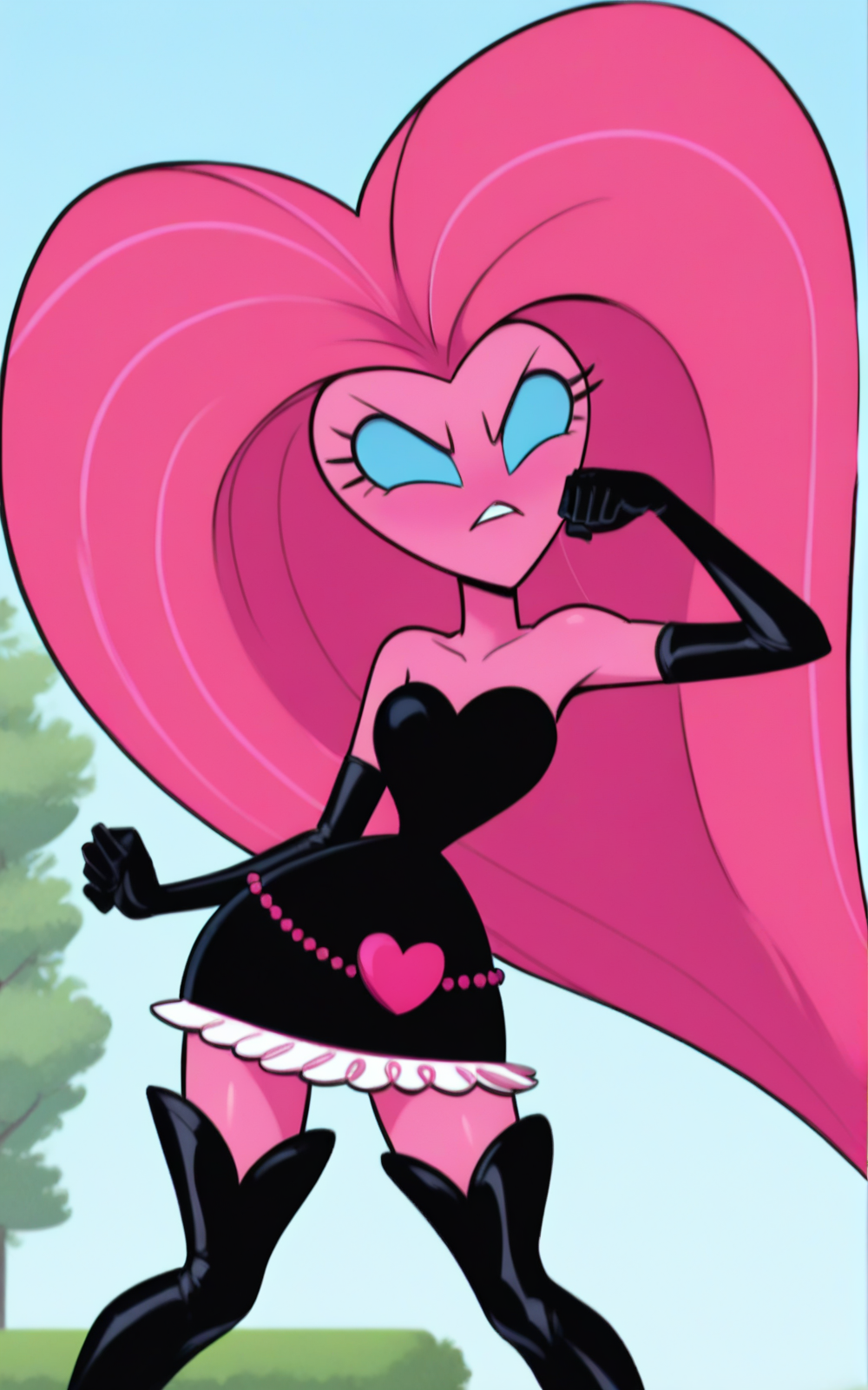 강화 태그: 두꺼운 머리카락, 긴 머리카락, 파란 눈, 분홍색 피부, 분홍색 머리카락