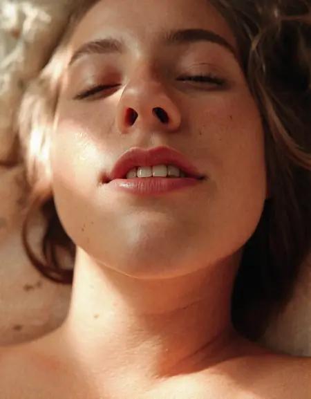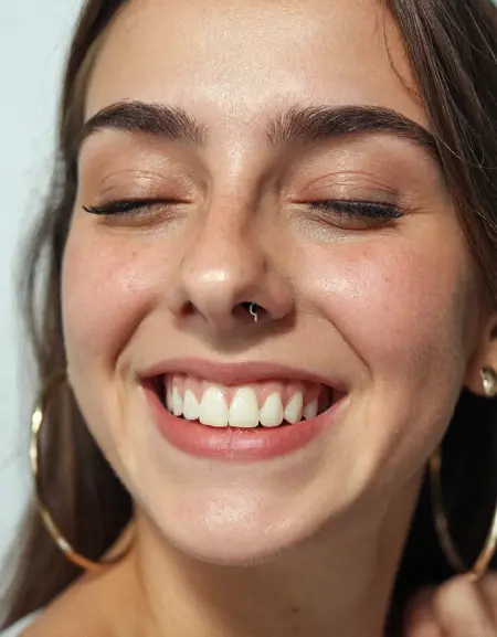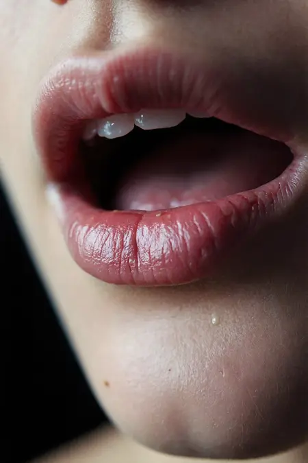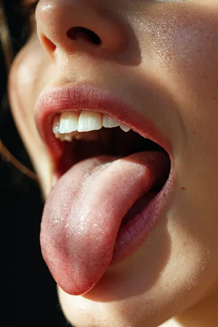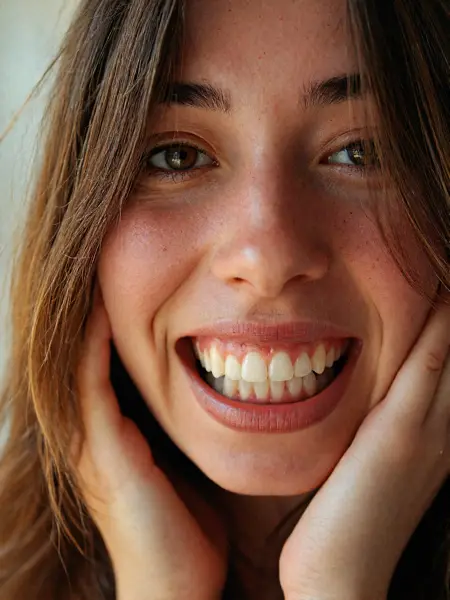 茶色の目、長い髪、口を開けた若いアマチュア女性の顔の写真。焦点は口にあり、完璧に対称的な歯を強調。画像は詳細で、肌の自然な質感、毛穴、しみ、ほくろ、毛、そして口内の微妙な光沢まで捉えられている。
