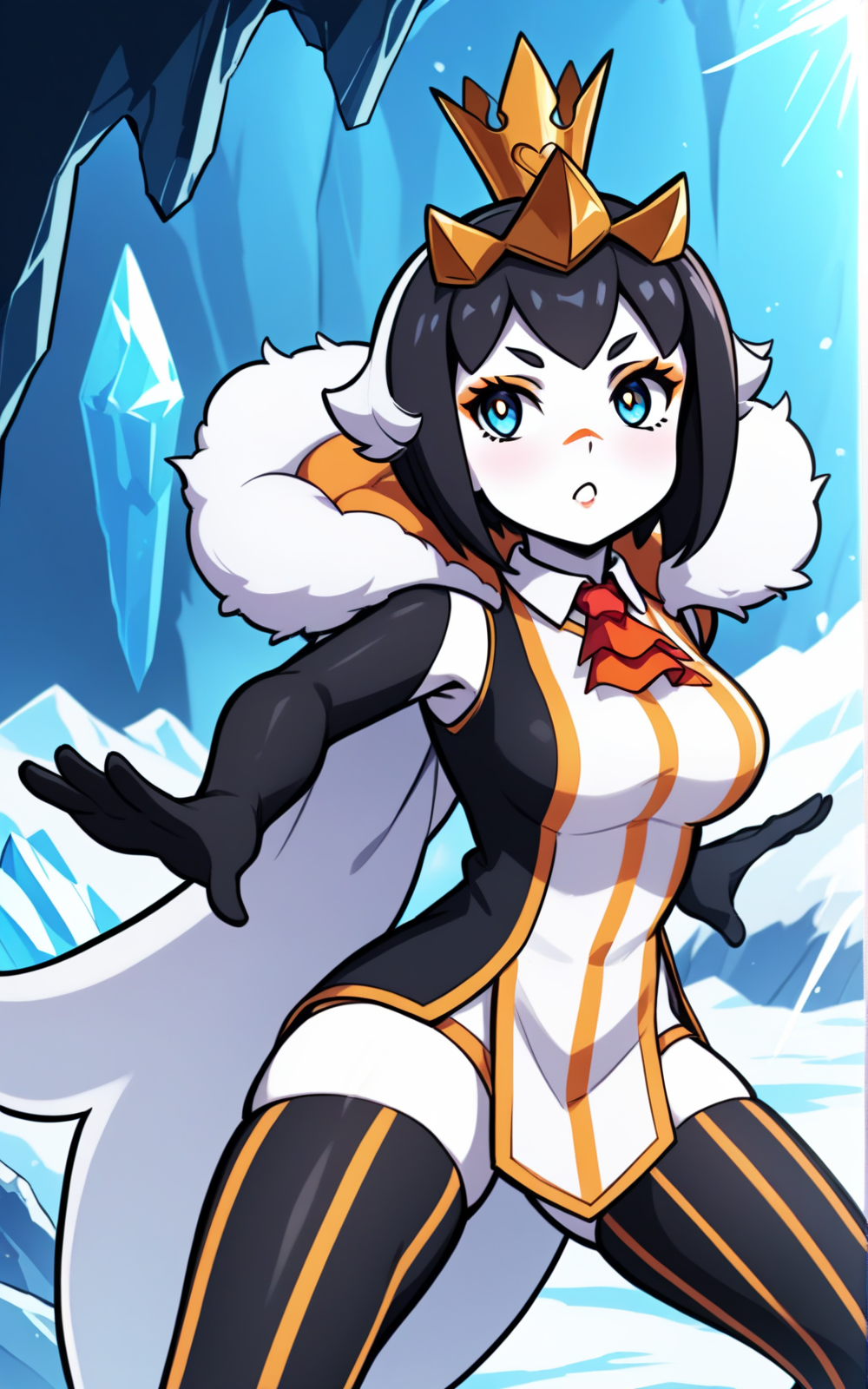 衣装:王冠、ティアラ、 thighhighs、手袋、肘まで手袋、黒いthighhighs、黒い手袋、ドレス、アスコット、縦縞、縦縞のthighhighs、白いドレス、襟付き、多色のドレス