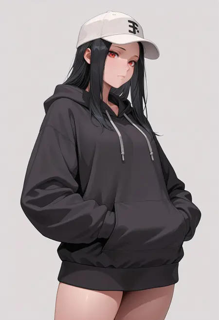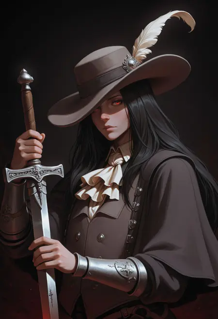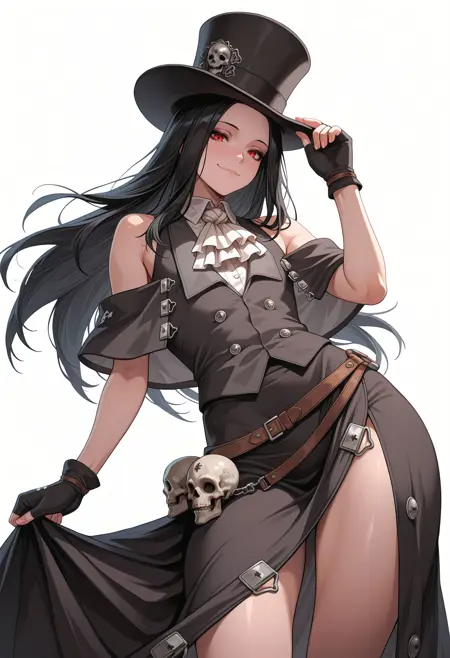 トリガー: _1other, 黒髪, 長髪, 赤い目, 中性, 高いハット, 指なし手袋, 白いアスコット, 白い手袋, 肩を露出, 片側不対称な手袋, 片側不対称な袖, 長いスカート, 黒い頭部装飾, ブーツ, _