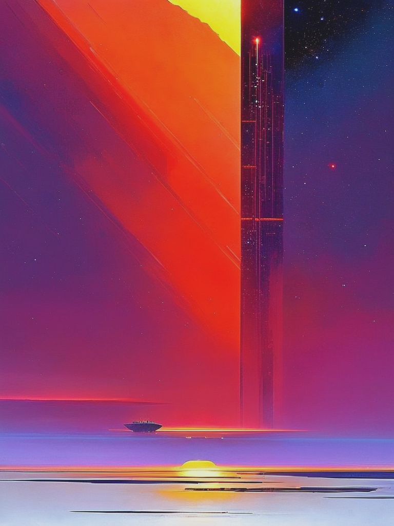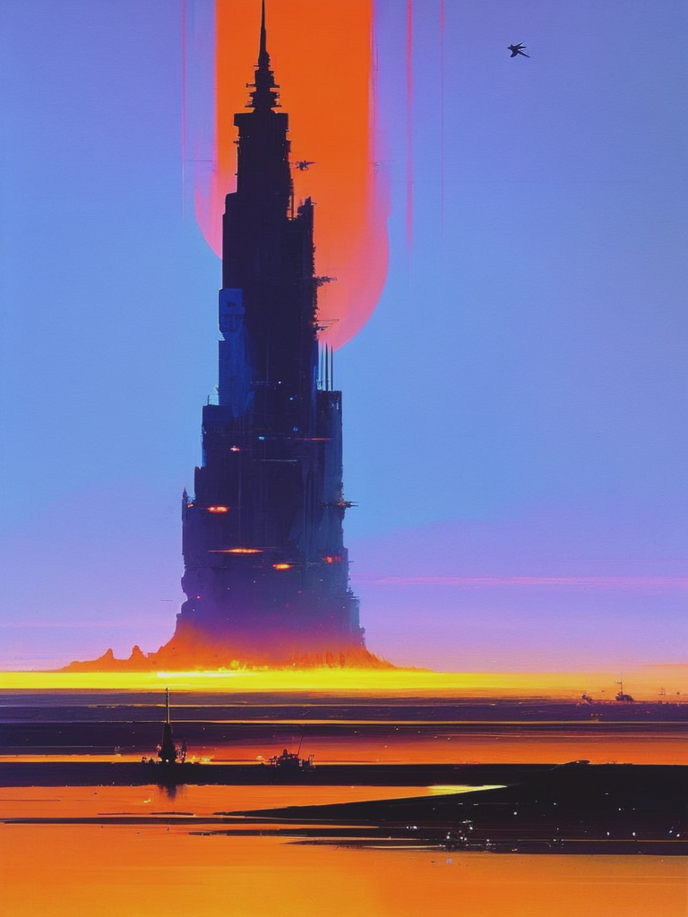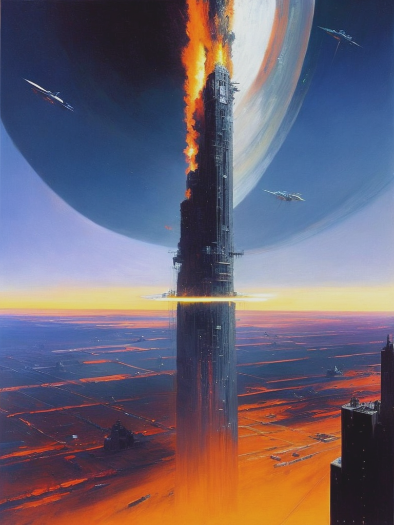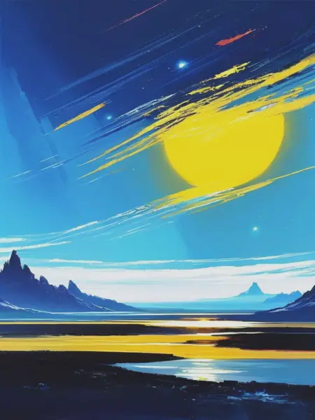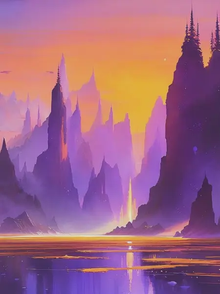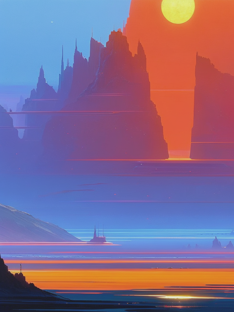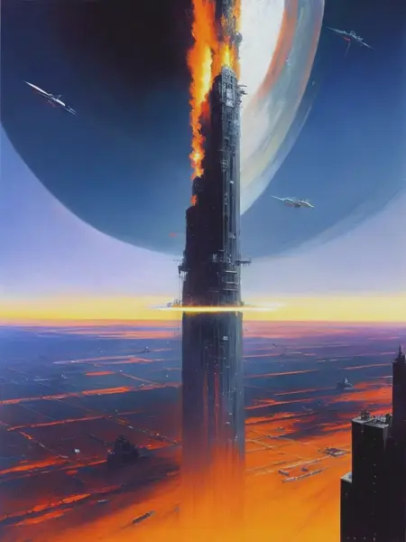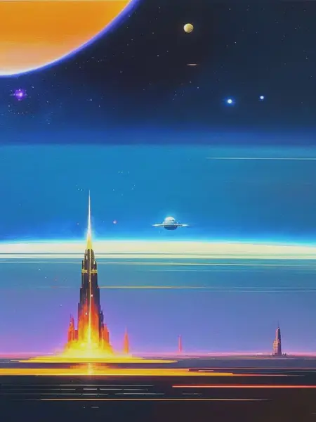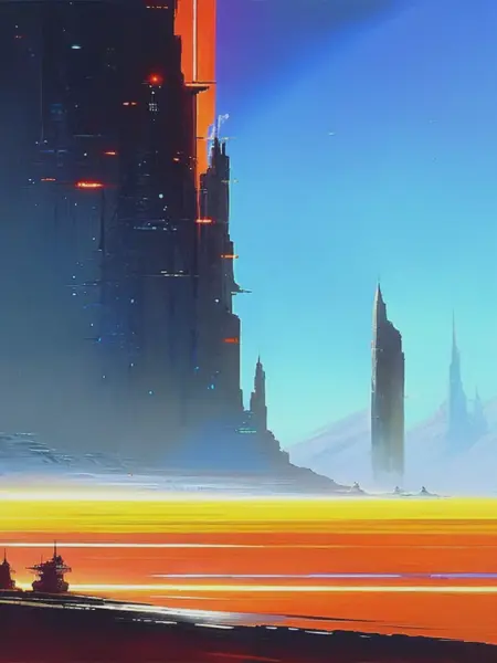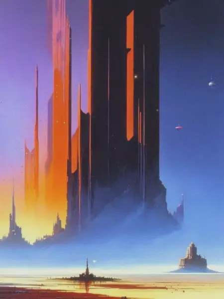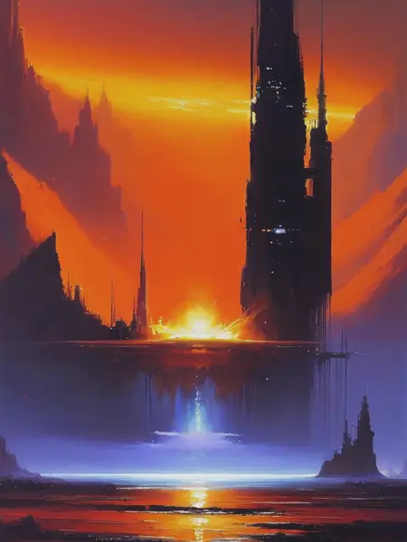 His style can be described as atmospheric and epic, often featuring vast alien landscapes, futuristic cities, and fantastical scenes.