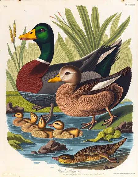 奥杜邦的插图采用水彩、墨水和蜡笔相结合的方式创作,描绘了鸟类及其他野生动物在其自然栖息地中的景象。