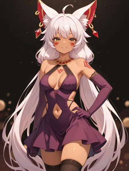 lupina, 1girl, solo, long hair, animal ears, brown eyes, medium breasts, yellow eyes, cat ears, dark skin, dark-skinned female, facial mark, armlet, egyptian clothes, white hair