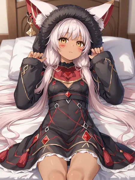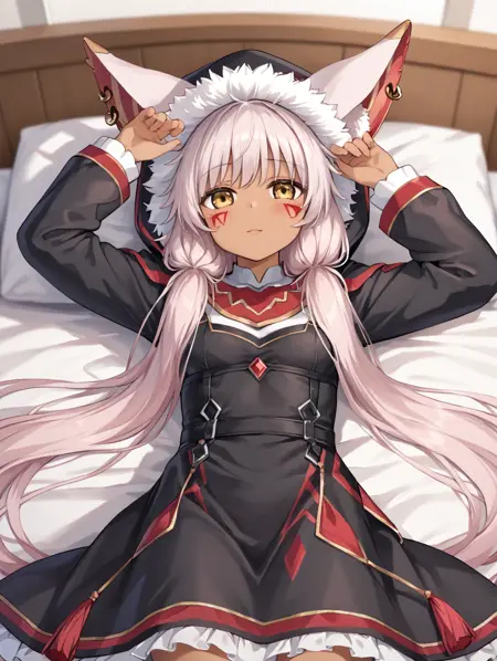 lupina, 1girl, solo, 長い髪, 手袋, 長い袖, 動物の耳, ツインテール, ジュエリー, 黄色い目, 黒い手袋, 暗い肌, フード, 動物の耳のふわふわ, 毛皮のトリム, チェーン, 低いツインテール, 顔のマーク, 毛皮トリム付き袖, 頭飾りを通した耳, 毛皮トリム付きフード, 白い髪, 杖, 宝石