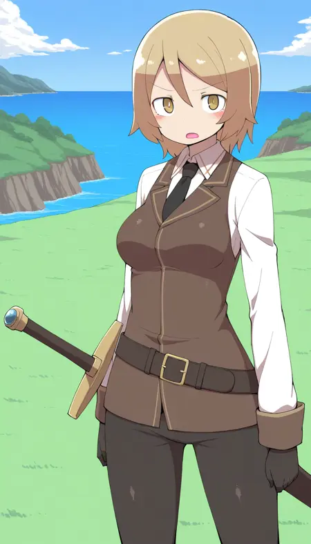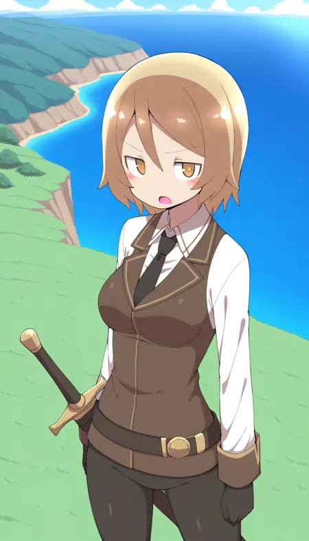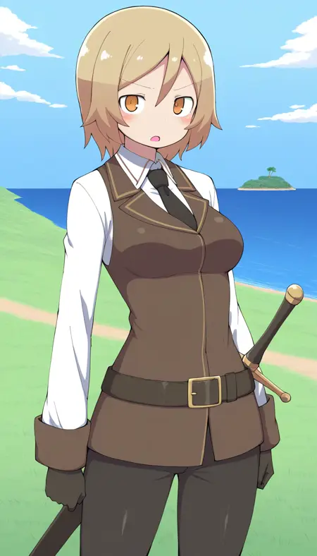 Moka_margaret, 1girl, short hair, blonde hair, brown hair, orange eyes, breasts,