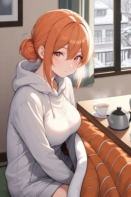 외모: yghmm, 중간 크기의 가슴, 주황색 눈, 주황색 머리카락, 눈 사이의 머리카락, 옆머리, 단일 머리 뭉치