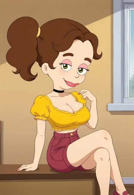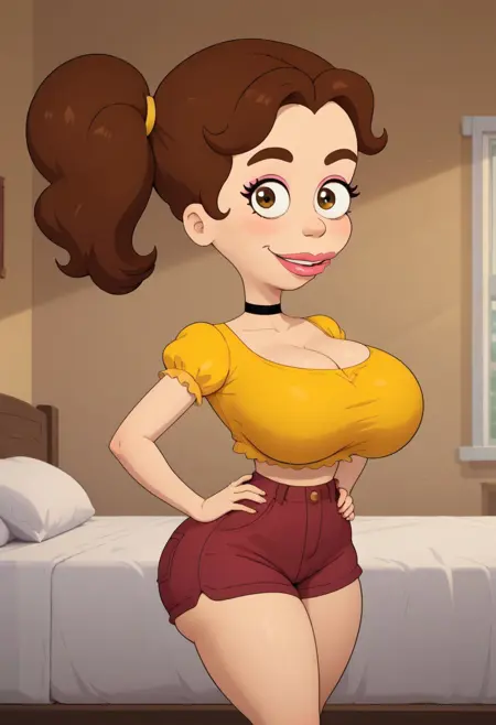 Trigger words: 1girl, Solo, Cherry_BM, light skin, hazel eyes, brown eyebrows, wavy brown hair, ponytail hair, yellow hairband, pink lipstick, pink eyeshadow, black choker, yellow crop top with puffy sleeves, cleavage, maroon shorts, flat maroon shoes