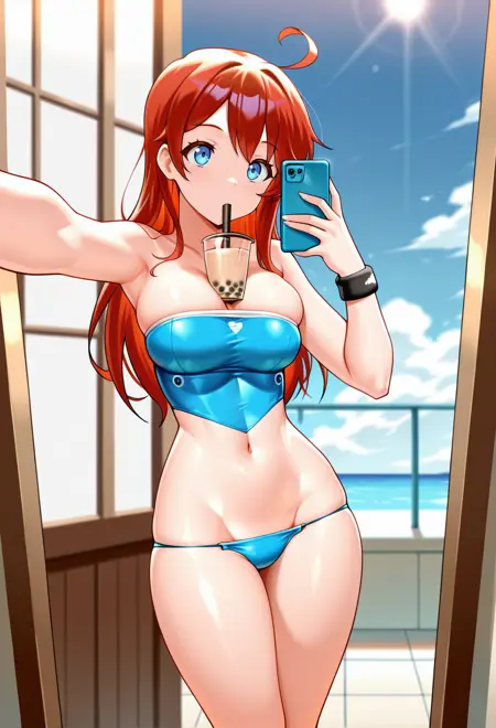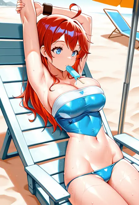 blue bikini, strapless swimsuit, tankini, wristband, bikini bottom only, lowleg bikini,