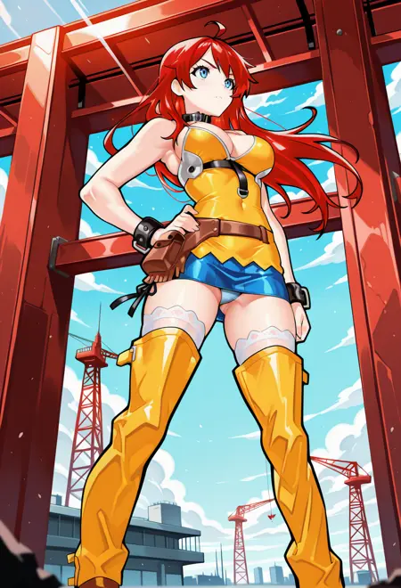 black collar, bare shoulders, yellow camisole, belt, belt pouch, blue skirt, miniskirt, thigh boots, fringe trim, brown footwear,