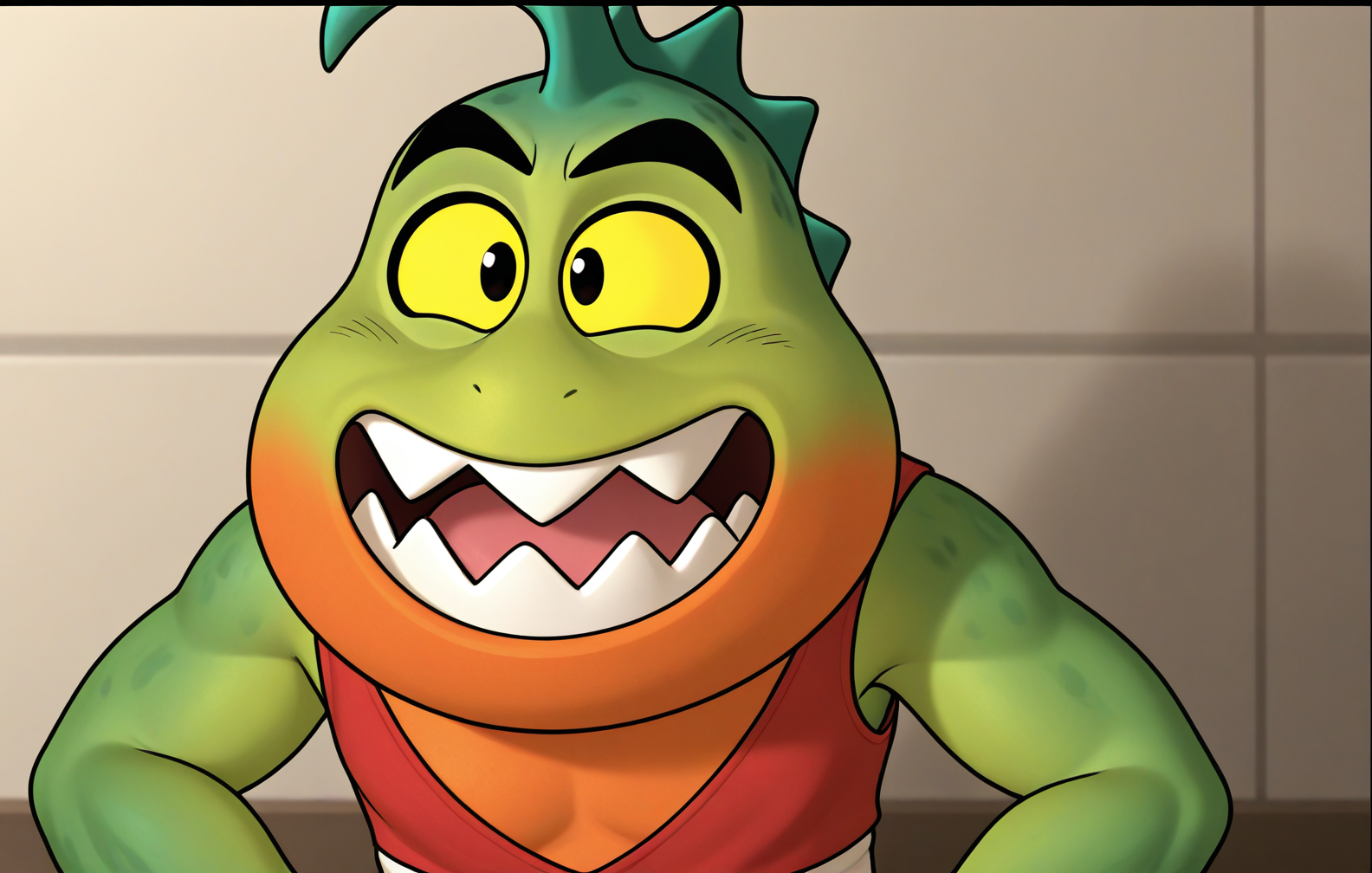 mr. piranha(ピラニア、男性、緑色の肌、オレンジ色の腹部、黄色の虹彩)
