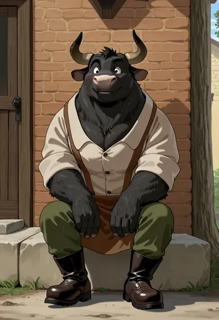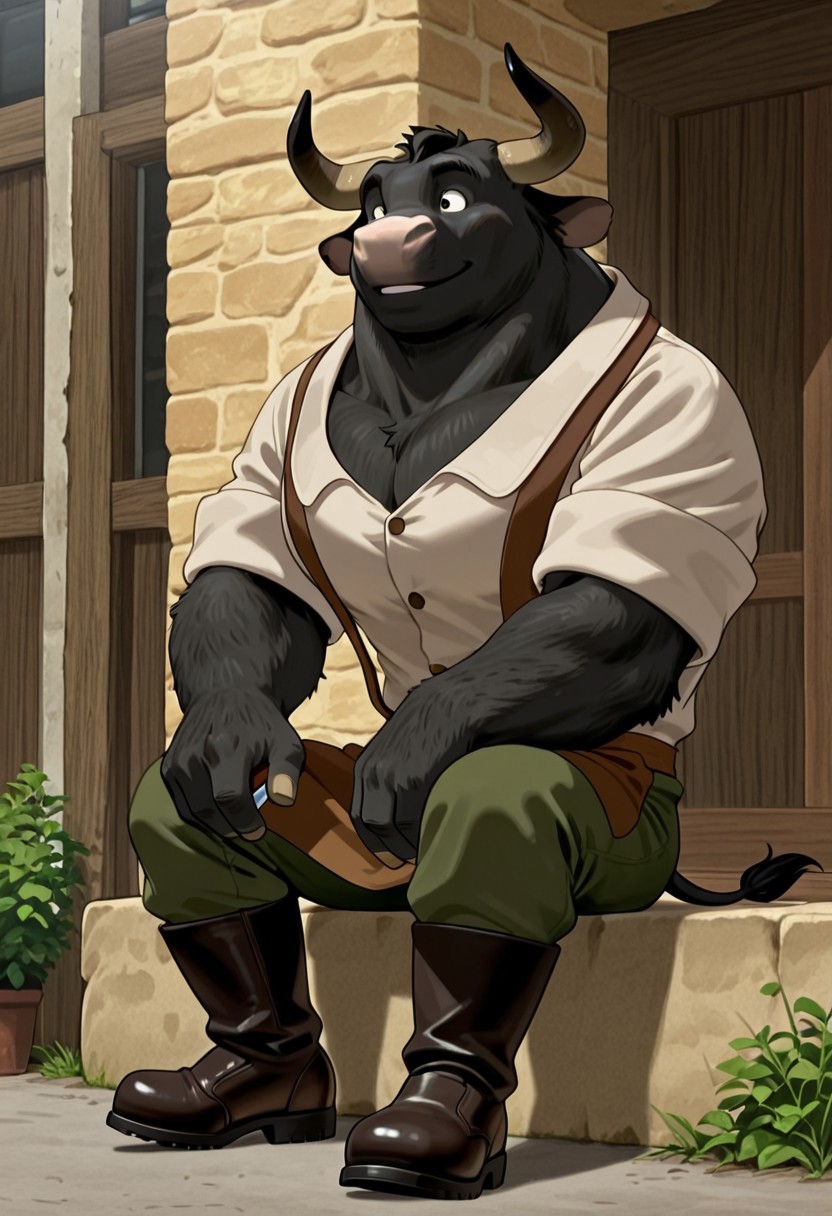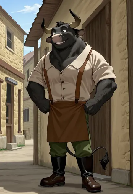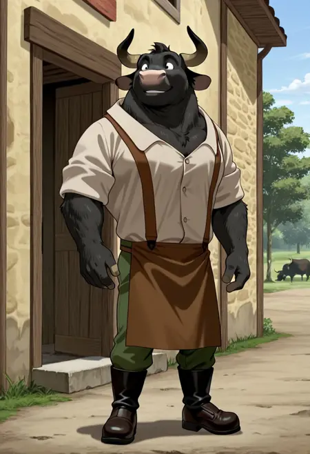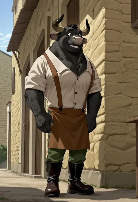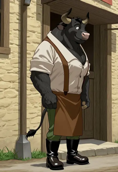 1boy, male, anthro, bull, big, black fur, horns, pink nose, white collared shirt, brown apron, green pants, black boots