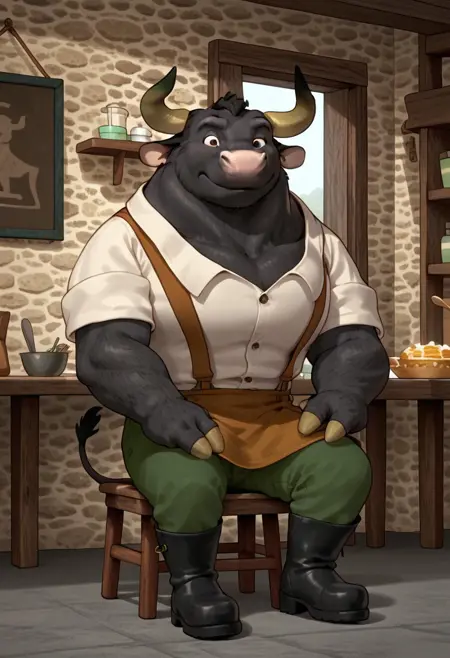 1boy, male, anthro, bull, big, black fur, horns, pink nose, white collared shirt, brown apron, green pants, black boots