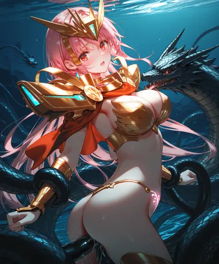 Pls Try: Raimu lora:Raimu-000009:1, gold armor, long pink hair, red eyes, green crystal,