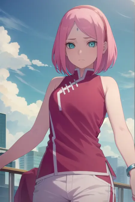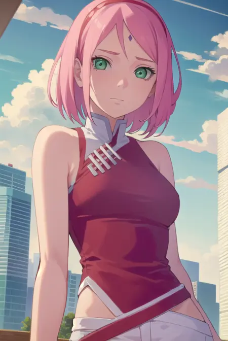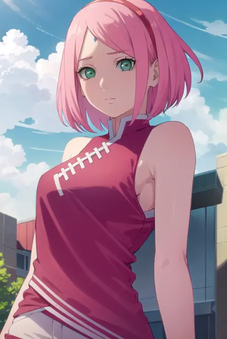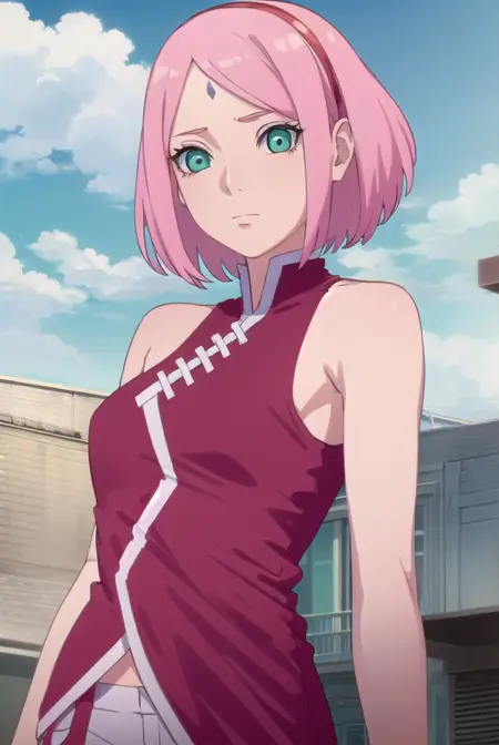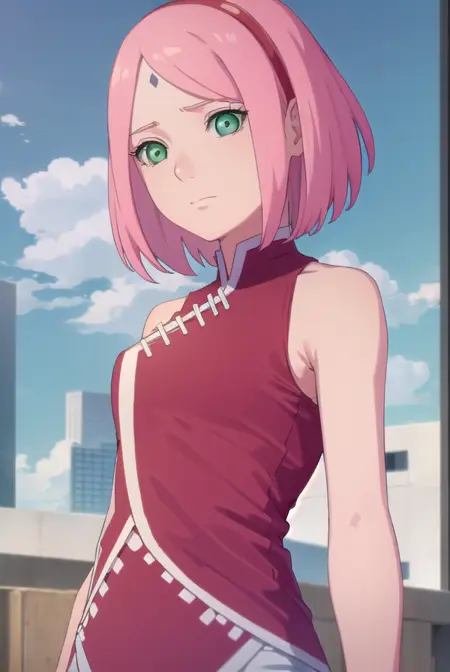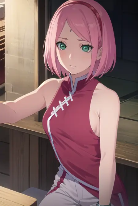 sakura haruno, 단발, 앞머리, (녹색 눈:1.5), 핑크색 머리, 헤어밴드, 얼굴 무늬, (이마 무늬:1.2), 빨간 헤어밴드, (플러싱된 앞머리:1.5),