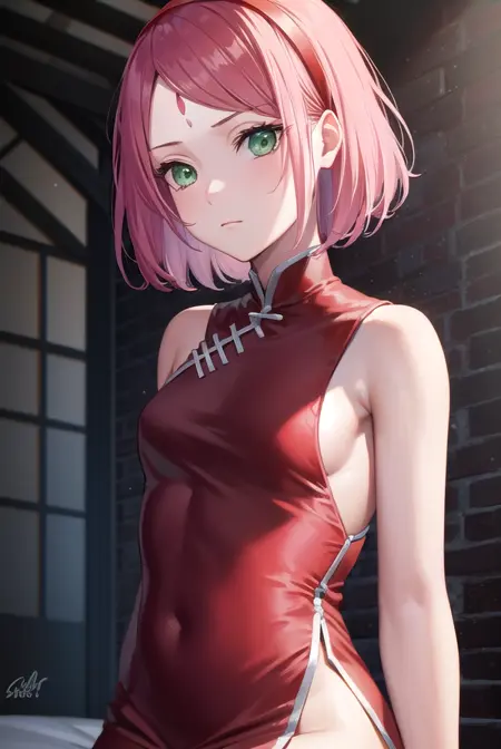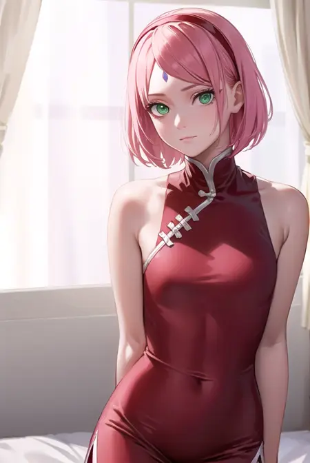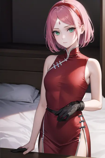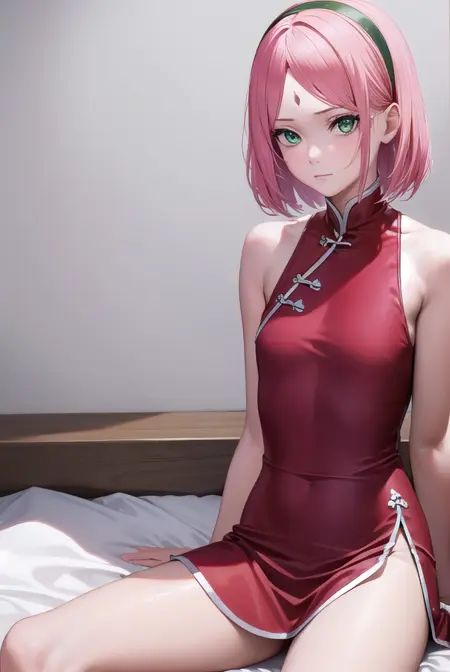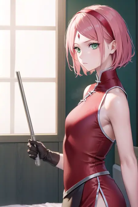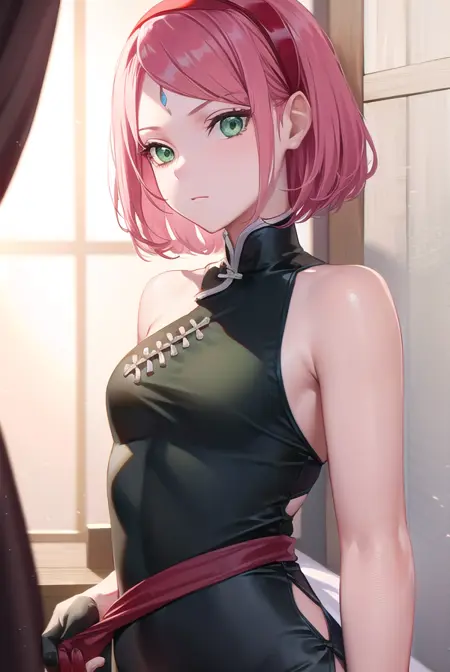 sakura haruno, short hair, bangs, (green eyes:1.5), pink hair, hairband, facial mark, (forehead mark:1.2), red hairband, (swept bangs:1.5),