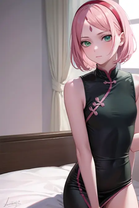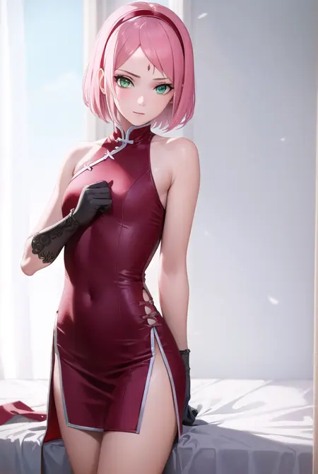 sakura haruno, short hair, (green eyes:1.5), pink hair, headband, hair intakes, forehead protector, parted bangs,