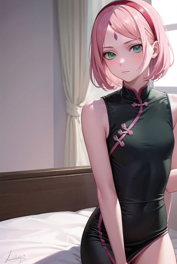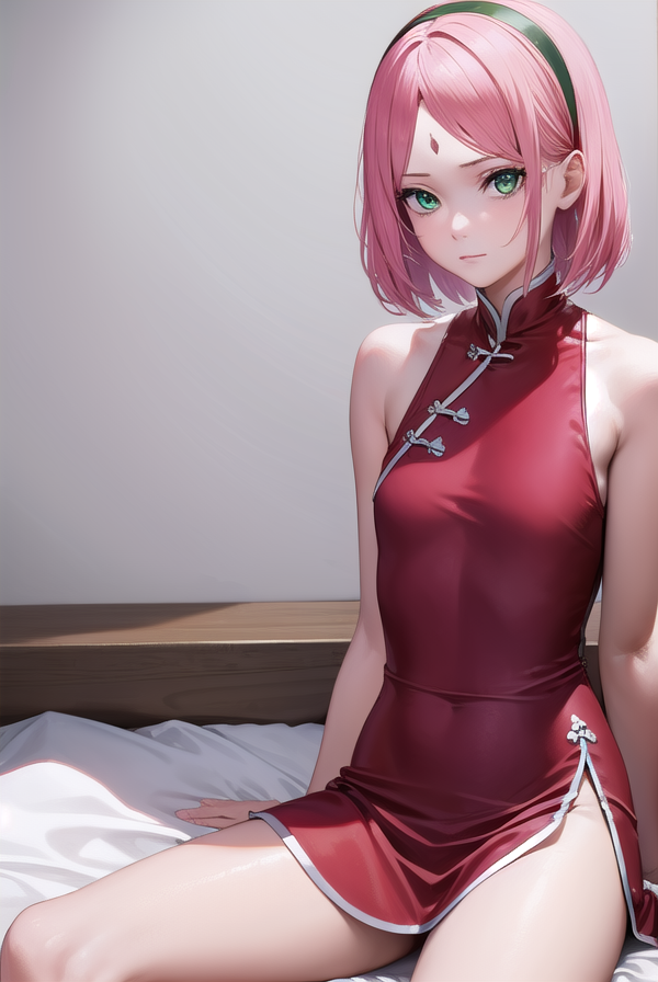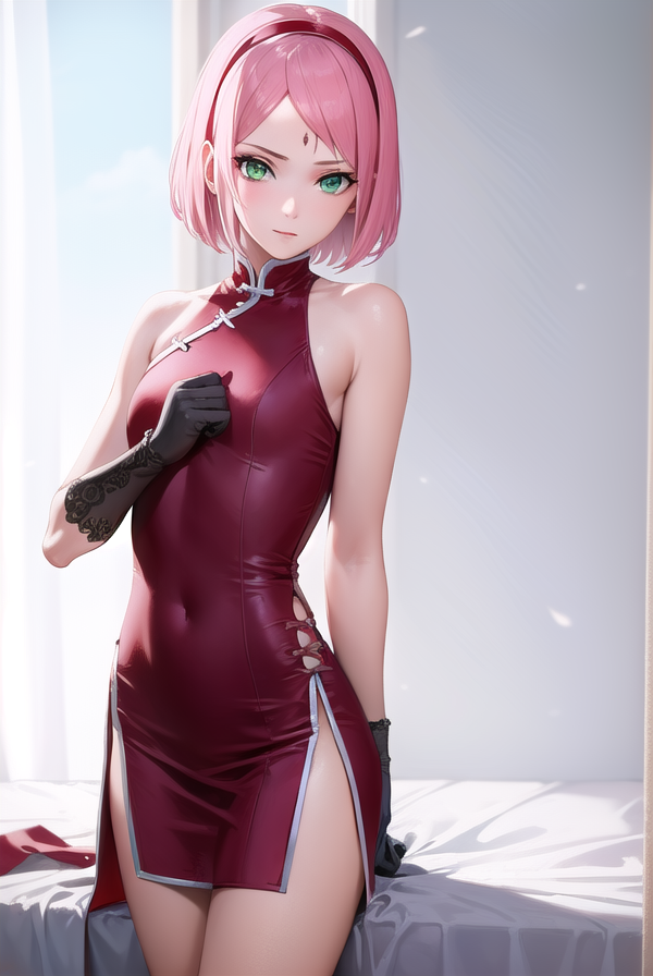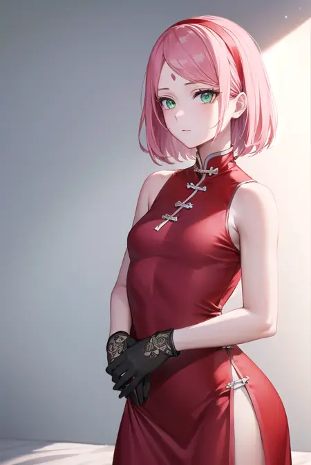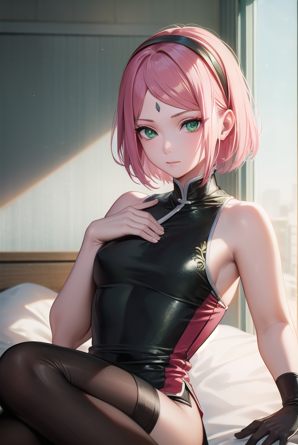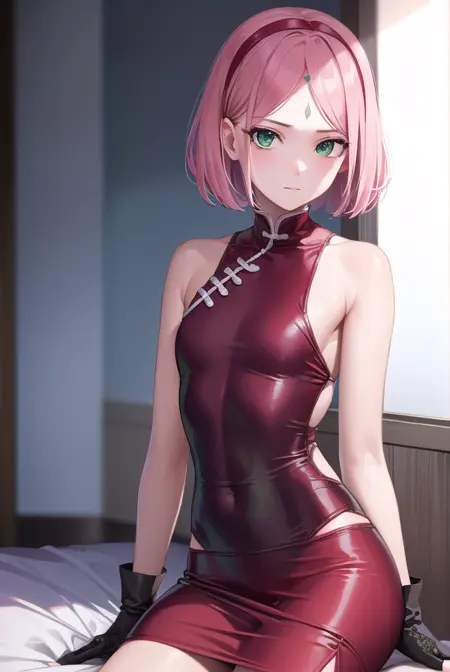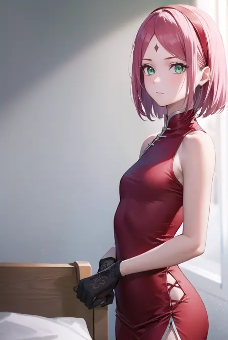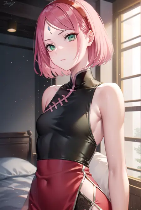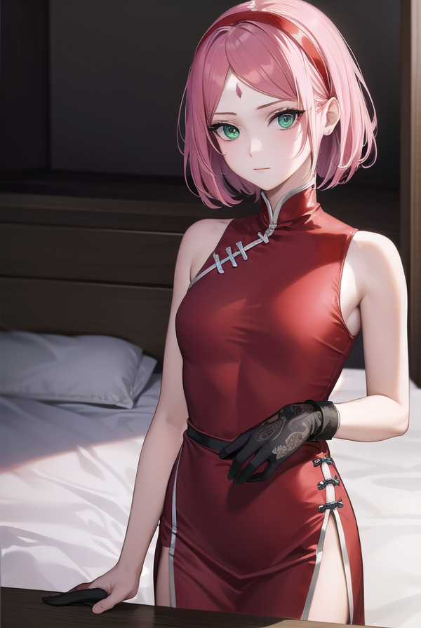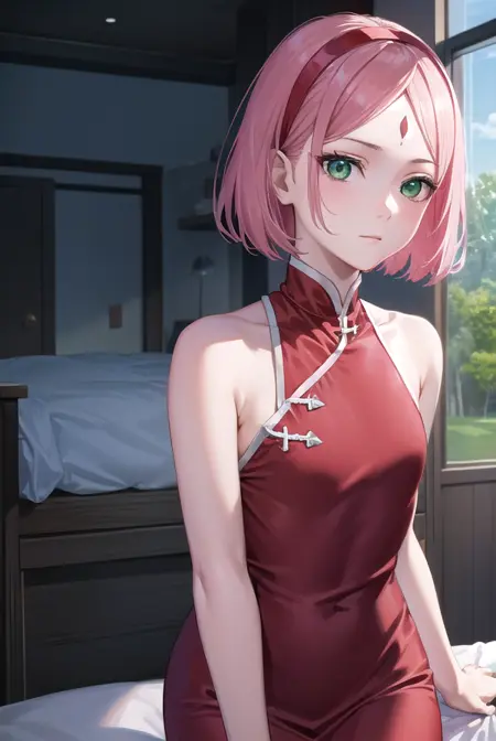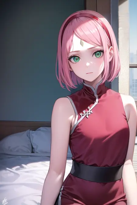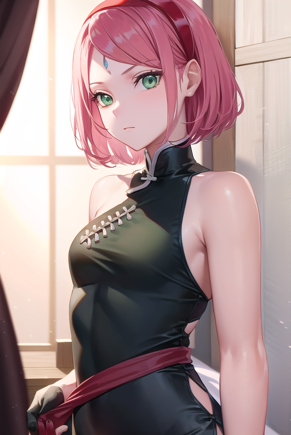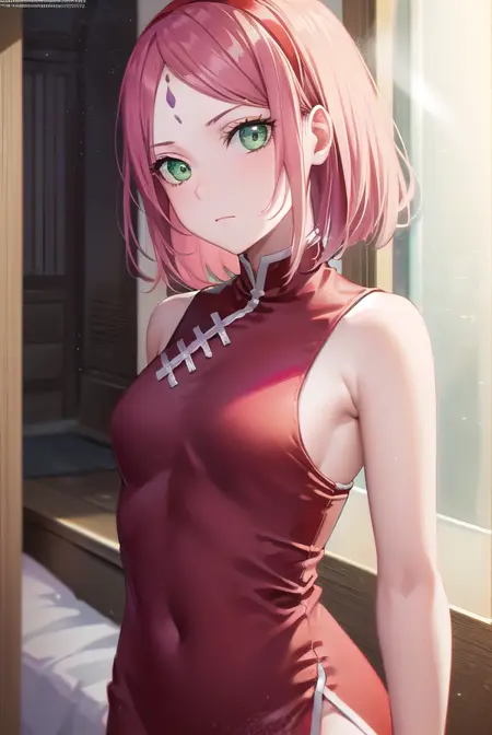sakura haruno,短发,刘海,(绿色眼睛:1.5),粉发,发带,面部标记,(额头标记:1.2),红色发带,(飘逸刘海:1.5),