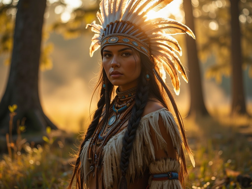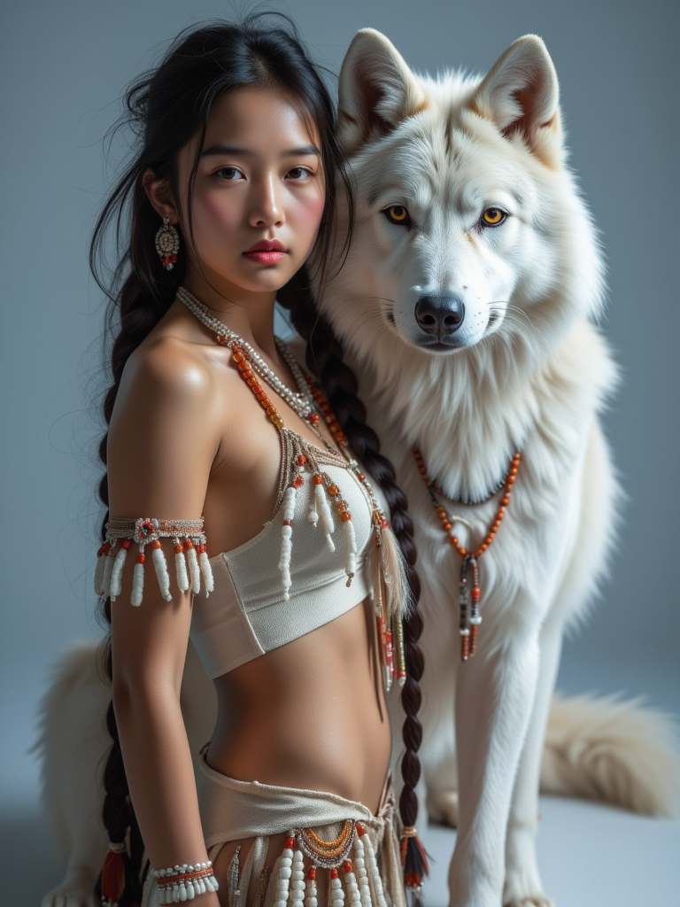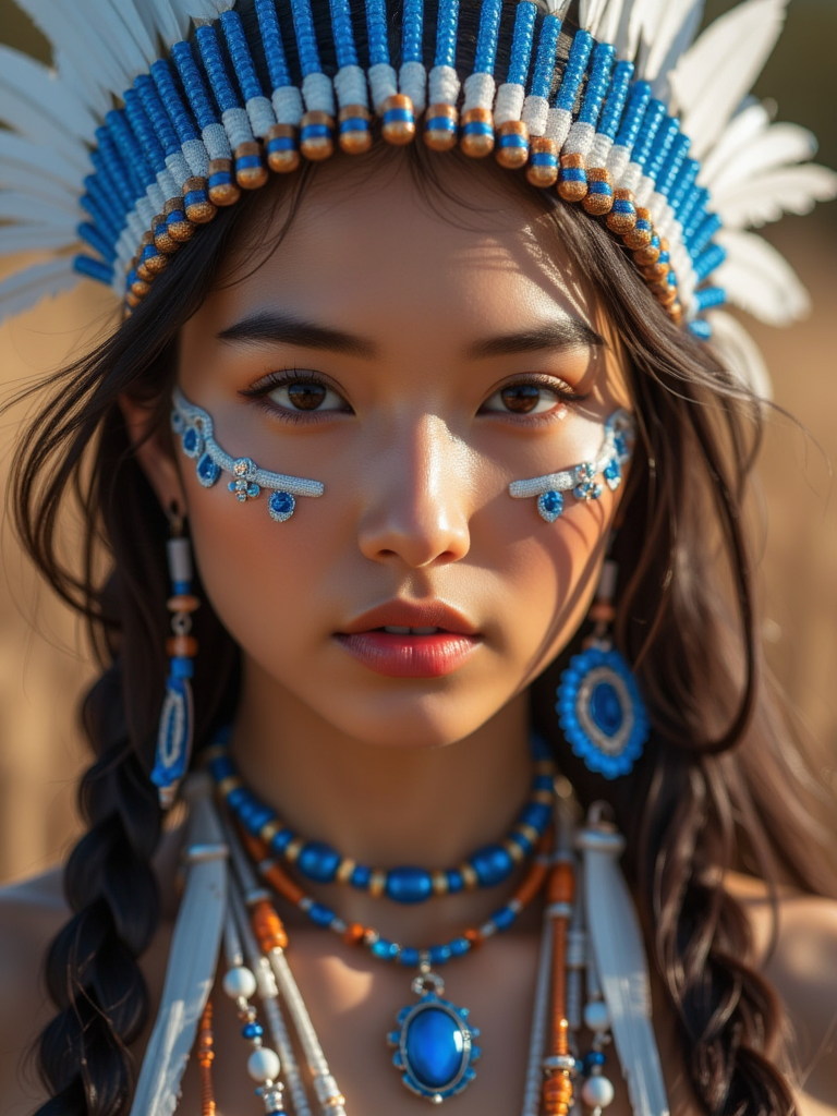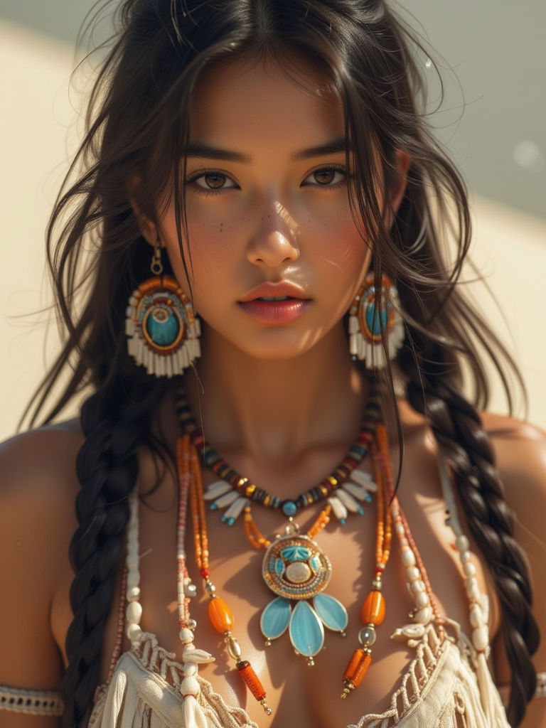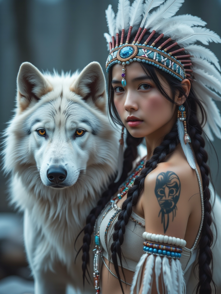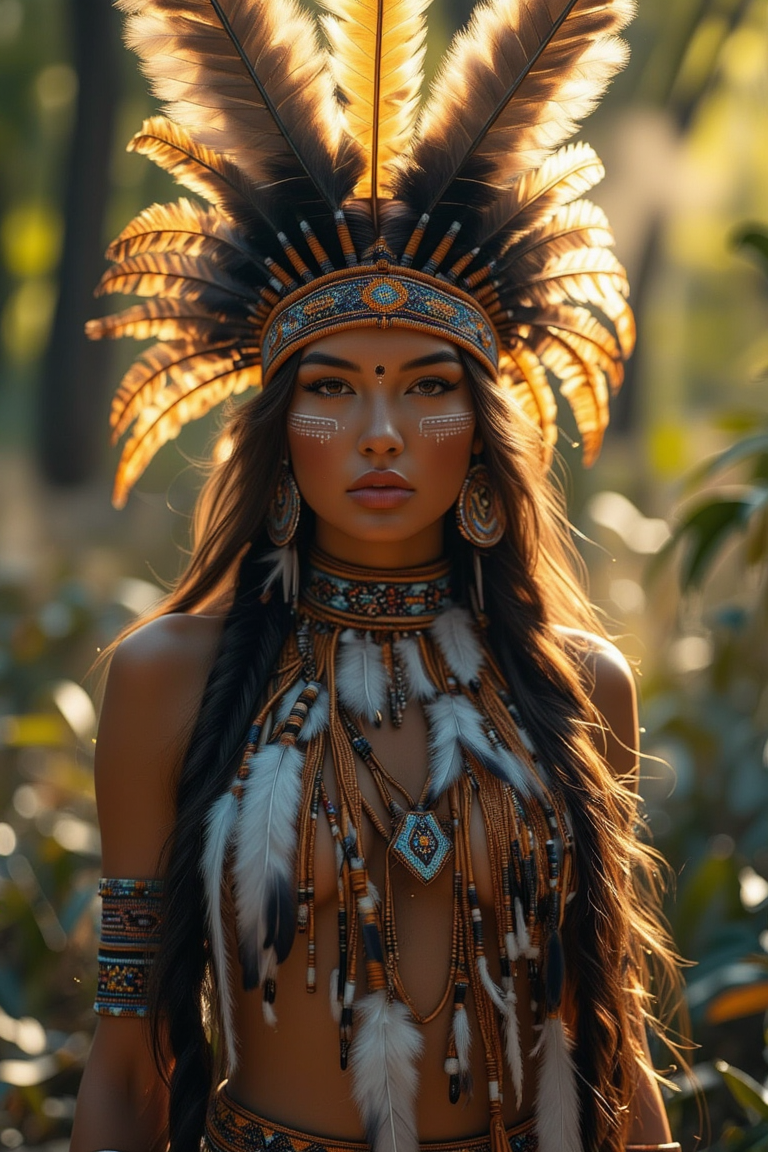 CTAI-Tribe,一幅描绘一位部落女性与美洲豹紧密站在一起的肖像,背景为茂密的丛林。女性面部和身体绘有复杂的黑色部落图案,身着由羽毛、珠子和天然材料制成的传统饰品。她表情凶猛而自信,身旁的美洲豹微微龇牙,露出锋利的牙齿和锐利的黄眼睛。背景布满柔和的绿色植被,为画面增添了深度与野性。光线柔和自然,突出了女性皮肤、美洲豹皮毛以及精致饰品的质感。