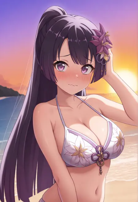 - pcrriri,长发,rismswimsuit,紫色头发,黑色头发,马尾辫,发饰,发花,花卉图案,露胸,白色比基尼,前系带上衣,纱笼,