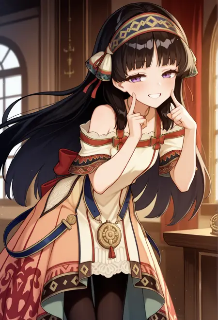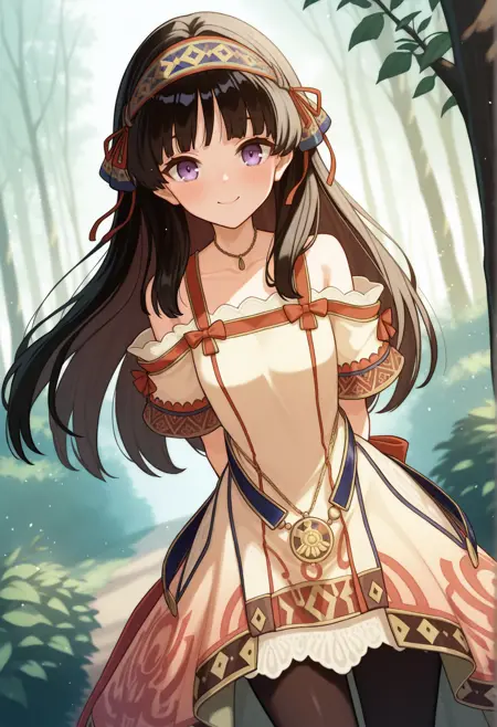 atslstera,长发,发带,紫色眼睛,slsteradef,米色连衣裙,多彩连衣裙,印花连衣裙,项链,露肩连衣裙,吊坠,蓝色腰带,裸露肩膀,黑色丝袜,