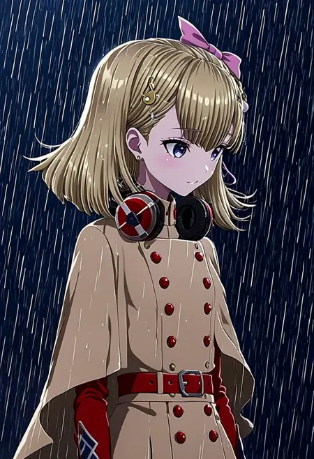 レインコート: "Pucci Lavminはレッドのボタンとレッドのベルトが付いたベージュのダブルブレストのケープコート、レッドの太もも以上までのソックス、黒いブーツを着用しています。彼女は短くてレイヤードされた金色の髪をピンクのリボンで後ろに結び、頭の左側にはウサギの耳の髪留めをつけています。彼女は赤いヘッドフォンを着用しています。"