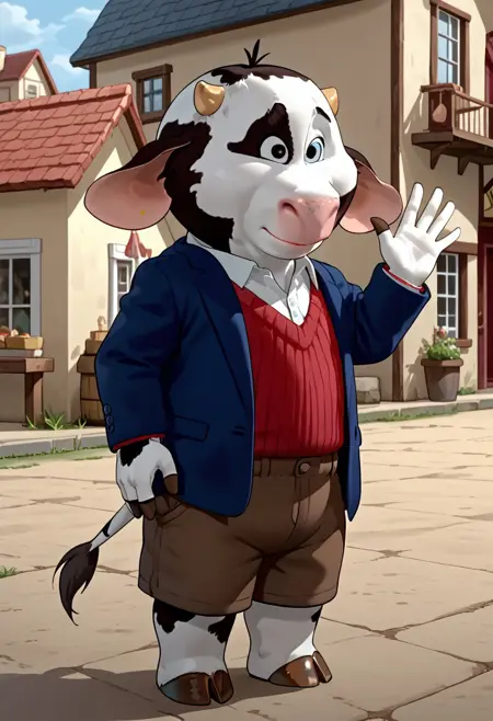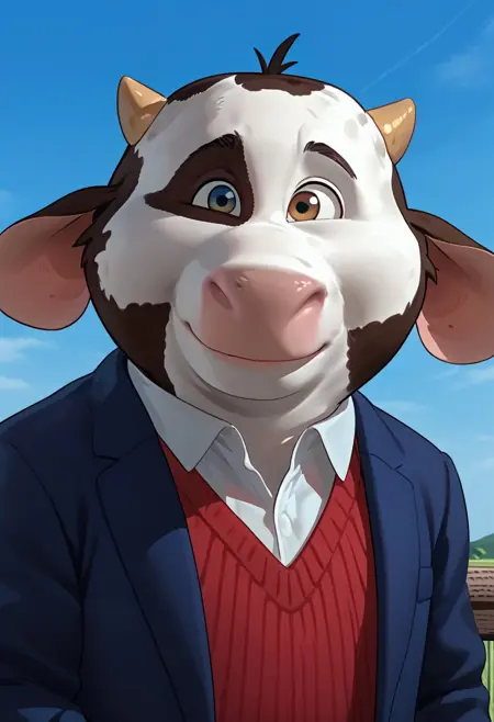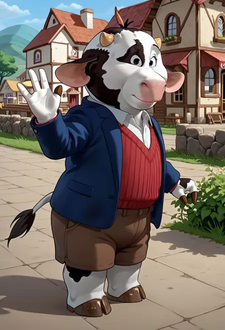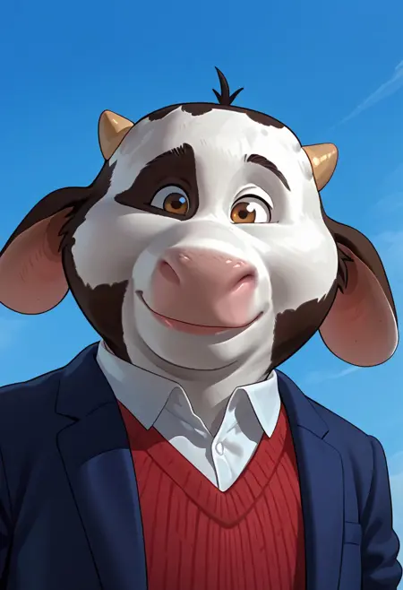 1boy, anthro, male, cow, pink nose, small horns, floppy ears, black and white fur, cow pattern fur, cow spots, white shirt, red jumper, brown shorts, blue blazer, brown hooves, cow tail