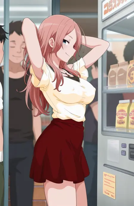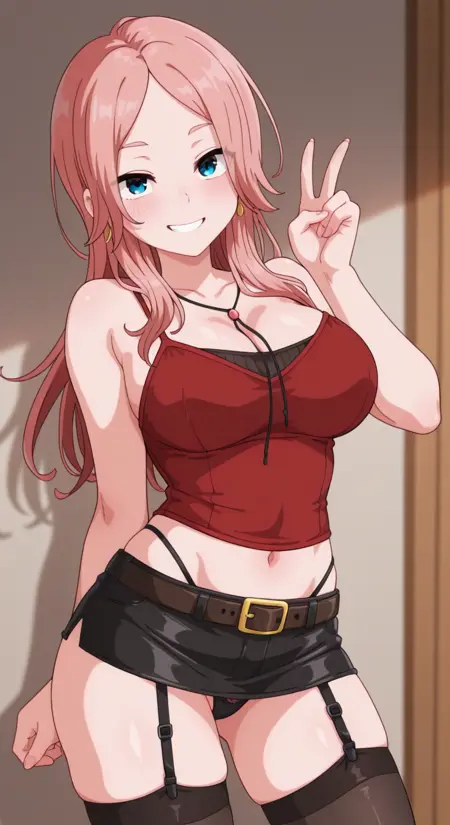 服装1:黄色露肩上衣,黑色背心,红色裙子,项链,粉色袜子,蓝色内裤,蓝色胸罩