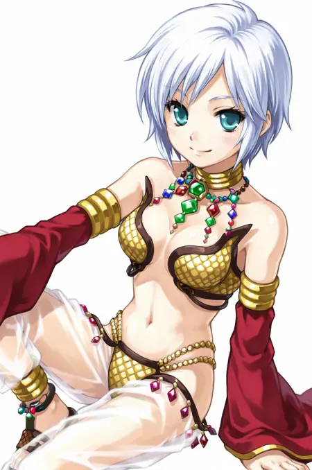 프롬프트: gypsyRO, 보석, 목걸이, 골드 비늘 비키니, 흰색 투명한 바지, 배꼽, 지프시, 복부, 팔찌, 발목고리, 빨간 넓은 소매, 초커, 샌들