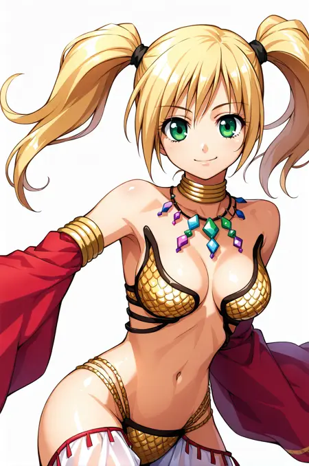 提示词:gypsyRO, 宝石, 项链, 金色鳞片比基尼, 白色透明长裤, 肚脐, 吉普赛人, 腰部, 手环, 脚环, 红色宽袖, 项圈, 凉鞋