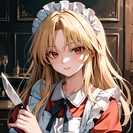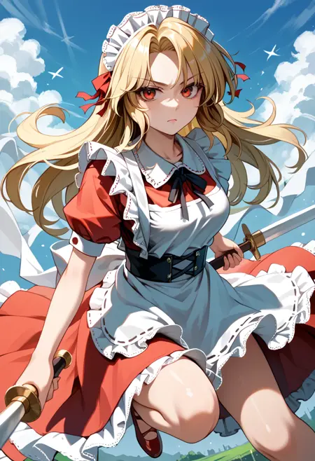 --> yumeko (touhou), ブロンドの髪、ドレス、エプロン、ロングヘア、剣、武器、メイド、メイドの頭飾り、持っている