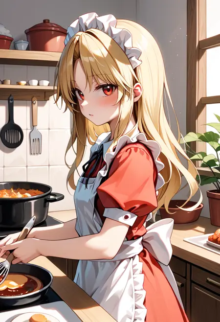 --> yumeko (touhou), ブロンドの髪、赤いドレス、エプロン、ロングヘア、メイド、メイドの頭飾り