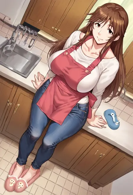 1girl, solo, brown hair, long hair, brown eyes, large breasts, collarbone, mature female, denim, jeans, white shirt,  apron, slippers,