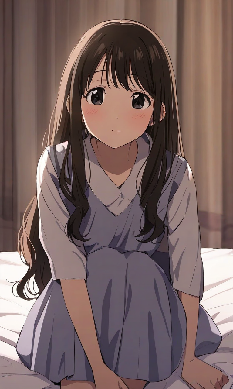 프롬프트(일반) - airi, score_7,score_8, score_9, 1girl, solo, long hair, brown hair, black eyes, sitting on a bed