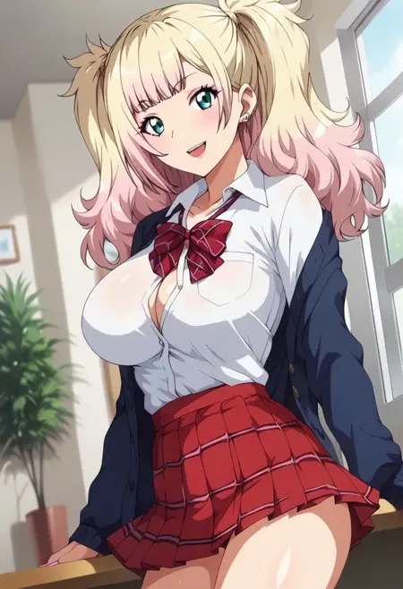 Yariko: 1girl,yariko,multicolored hair,gradient hair,blonde hair,pink hair,twintails,long hair, bangs,blue eyes,earrings,jewelry,gyaru,breasts,large breasts