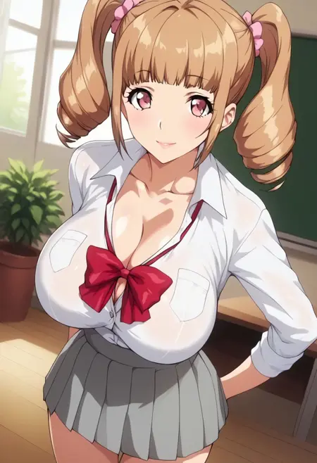 Bakako: 1girl,bakako,twintails, drill hair, brown hair,bangs,twin drills,pink eyes,cleavage,collarbone,breasts,large breasts