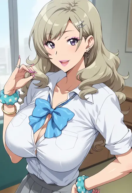 - 衣装: school uniform,scrunchie,wrist scrunchie,shirt,white shirt,open clothes,large breasts