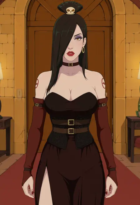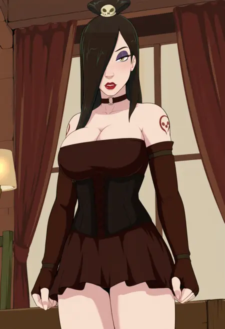 main tags: 1girl, solo, yellow eyes, brown eyes, long hair, hair over one eye, black hair, hair ornament, breasts, large breasts, makeup, lipstick, eyeshadow, tattoo,